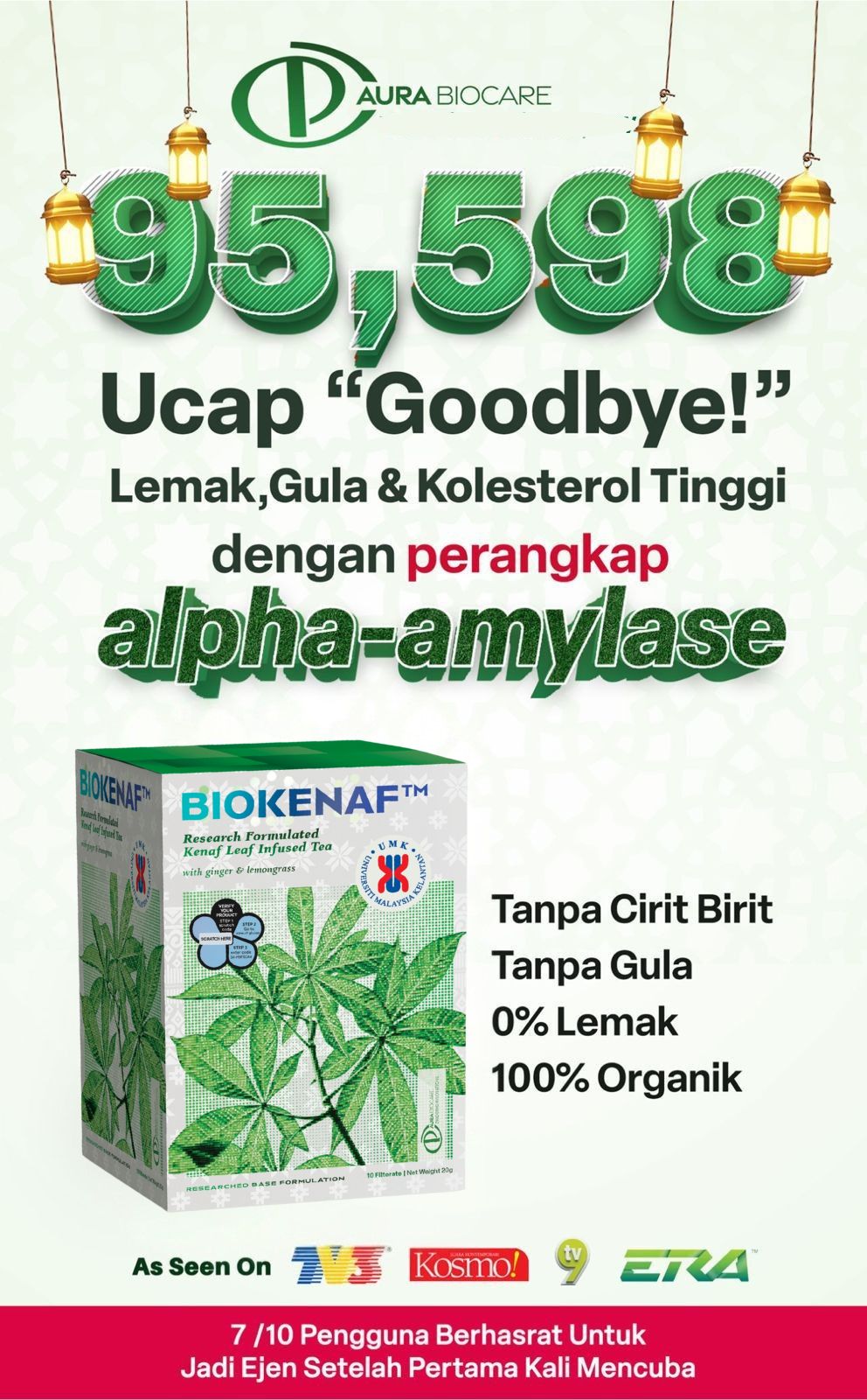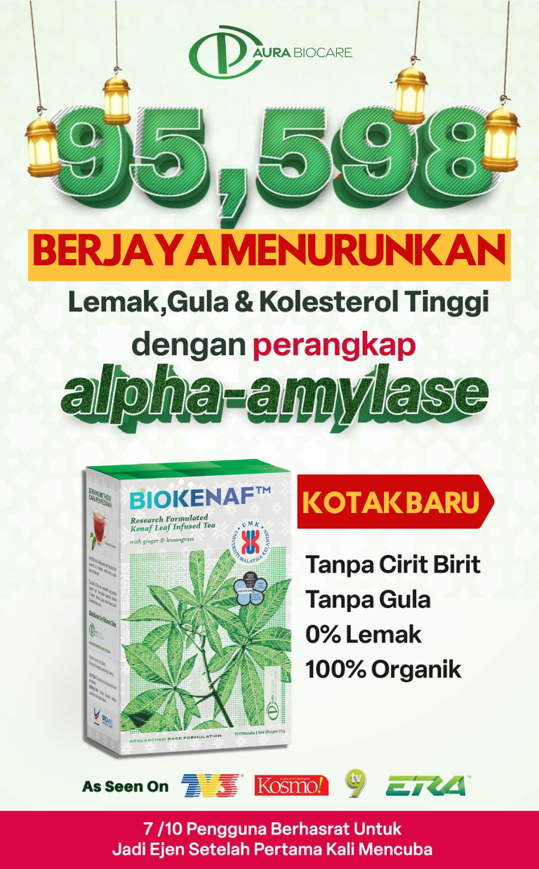 Biokenaf® diformulasi untuk target halang alpha-amylase dari memecahkan karbohidrat kepada gula & hentikan pembentukan lemak & triglycerides di hati.